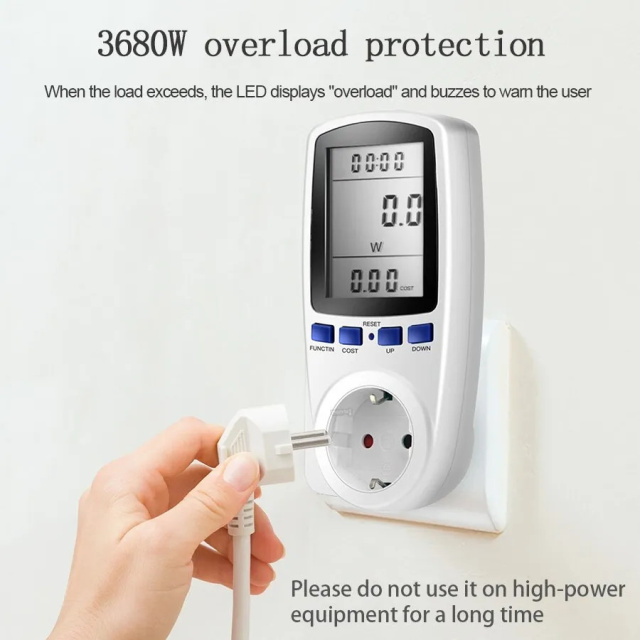 Цифровий ватраметр, вольтметр у розетку. Вимірювання потужності приладів, витрати електроенергії.Ефективний для контролю витрат енергії.- працює як розетка, - вимірює напругу- струм, - потужність витрати енергії по таймеру часу,