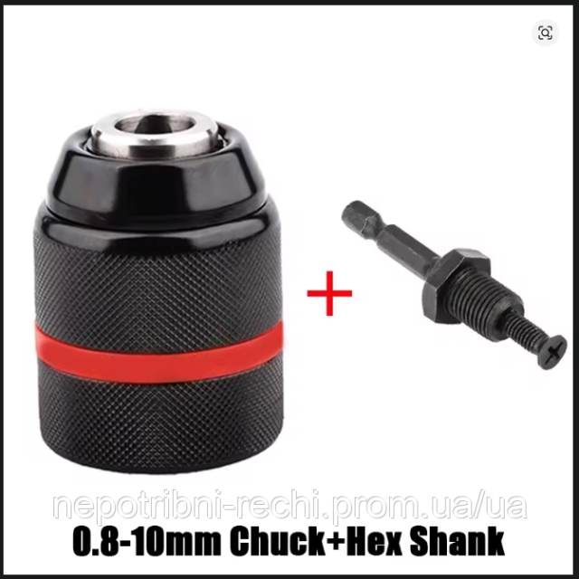 Металевий свердлильний патрон швидкозажимний 0.8-10 мм, шестигранник HEX швидкозахватний адаптер, патрон для свердл, викрутка, мітчик і гнізда.