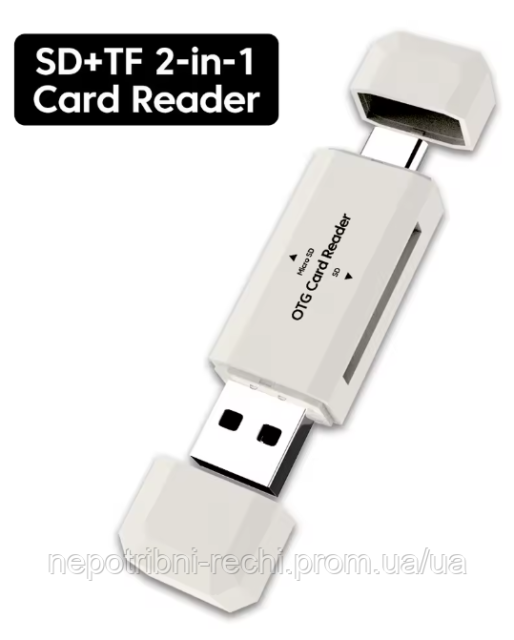 Кардрідер 2в1 USB Type C to SD card TF card adapter OTG для підключення до комп'ютера чи смартфону Картрідер В наявності кардрідери білого кольору.