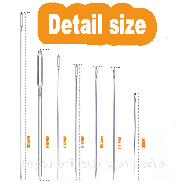 • Різні варіанти розмірів: Набір містить голки для ручного шиття з великими вушками різних розмірів, що відповідають різним швейним проектам та потребам.